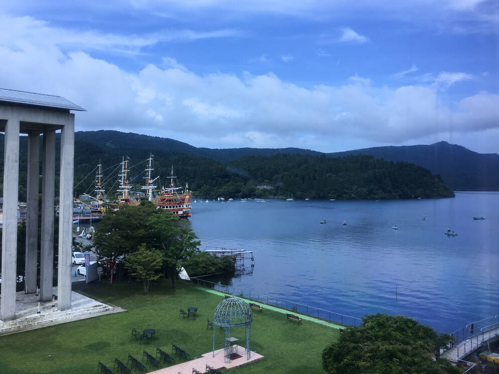 ホテルの部屋から眺める芦ノ湖と海賊船